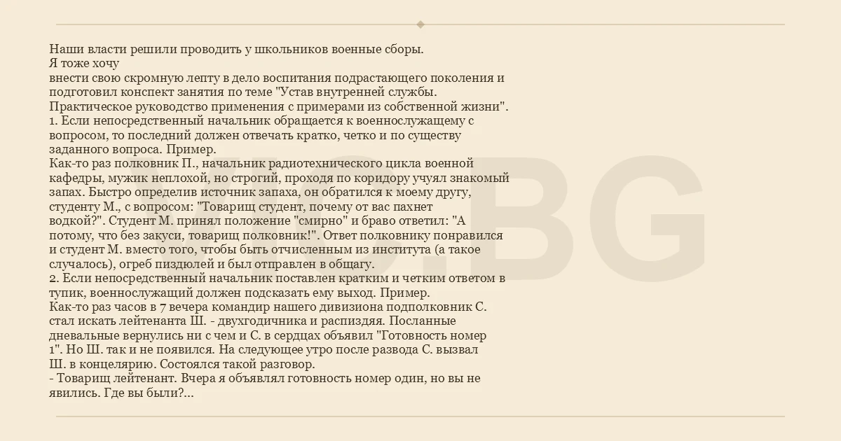 Наши власти решили проводить у школьников военные сборы. Я тоже хочу внести свою скромную лепту в дело воспитания подрастающего поколения и подготовил конспект занятия по теме "Устав внутренней службы. Практическое руководство применения с примерами из собственной жизни". 1. Если непосредственный начальник обращается к военнослужащему с вопросом, то последний должен отвечать кратко, четко и по существу заданного вопроса. Пример. Как-то раз полковник П., начальник радиотехнического цикла военной кафедры, мужик неплохой, но строгий, проходя по коридору учуял знакомый запах. Быстро определив источник запаха, он обратился к моему другу, студенту М., с вопросом: "Товарищ студент, почему от вас пахнет водкой?". Студент М. принял положение "смирно" и браво ответил: "А потому, что без закуси, товарищ полковник!". Ответ полковнику понравился и студент М. вместо того, чтобы быть отчисленным из института (а такое случалось), огреб пиздюлей и был отправлен в общагу. 2. Если непосредственный начальник поставлен кратким и четким ответом в тупик, военнослужащий должен подсказать ему выход. Пример. Как-то раз часов в 7 вечера командир нашего дивизиона подполковник С. стал искать лейтенанта Ш. - двухгодичника и распиздяя. Посланные дневальные вернулись ни с чем и С. в сердцах объявил "Готовность номер 1". Но Ш. так и не появился. На следующее утро после развода С. вызвал Ш. в концелярию. Состоялся такой разговор. - Товарищ лейтенант. Вчера я объявлял готовность номер один, но вы не явились. Где вы были? - Я был у бабы, товарищ полковник. (тут Ш. увидел, что С. поставлен ответом в тупик, т. к. он стал медленно краснеть и надуваться. Тогда Ш. продолжил...) - Вот вам, товарищ полковник, баба не нужна, а мне нужна. Прикажите, чтобы их возили в дивизион и я всегда буду на готовность бегать. Разговор на этом был закончен, поскольку с точки зрения устава Внутренней службы лейтенант Ш. был прав, ибо в уставе сказано: "Командир должен вникать в нужды подчиненных". Как подполковник С. отдавал приказ, я не знаю, но с той поры на попутных машинах в дивизион стали подбрасывать баб из городка и забирать из обратно. И так было до тех пор, пока нам не прислали молодого замполита. Но это уже тема для другого занятия.