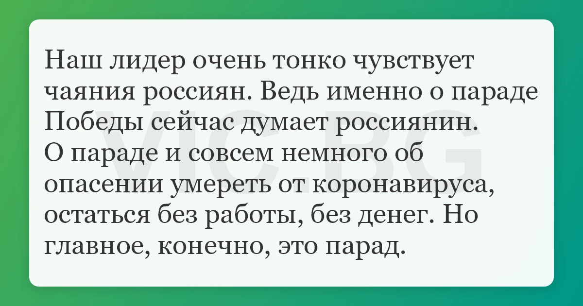 Наш лидер очень тонко чувствует чаяния россиян. Ведь именно о параде Победы сейчас думает россиянин. О параде и совсем немного об опасении умереть от коронавируса, остаться без работы, без денег. Но главное, конечно, это парад.