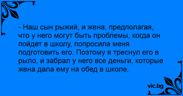 - Наш сын рыжий, и жена, предполагая, что у него могут быть проблемы, когда он пойдет в школу, попросила меня подготовить его. Поэтому я треснул его в рыло, и забрал у него все деньги, которые жена дала ему на обед в школе.