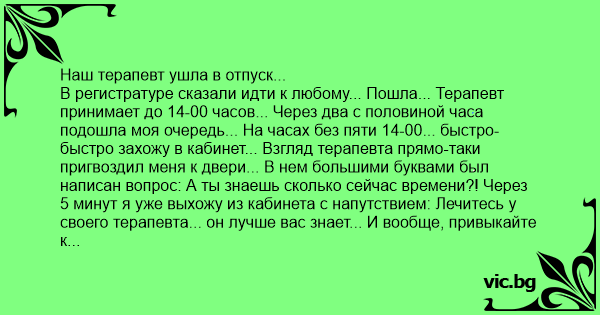 В регистратуре сказали идти к любому... Пошла... Терапевт принимает до 14-00 часов... Через два с половиной часа подошла моя очередь... На часах без пяти 14-00... быстро-быстро захожу в кабинет... Взгляд терапевта прямо-таки пригвоздил меня к двери... В нем большими буквами был написан вопрос: А ты знаешь сколько сейчас времени?! Через 5 минут я уже выхожу из кабинета с напутствием: Лечитесь у своего терапевта... он лучше вас знает... И вообще, привыкайте к своей болезни и учитесь жить с ней... Слегка ошалевшая от такого похода к врачу, иду домой, захожу в интернет, нахожу свою болячку и читаю: Прогноз лечения благоприятный... Болезнь лечится достаточно легко... Нужно только попасть к хорошему специалисту... Вот так!!! Не больше... и не меньше...=) Хм...