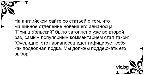 На английском сайте со статьей о том, что машинное отделение новейшего авианосца "Принц Уэльский" было затоплено уже во второй раз, самым популярным комментарием стал такой: "Очевидно, этот авианосец идентифицирует себя как подводная лодка. Мы должны поддержать его выбор".