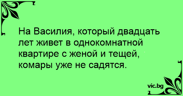 На Василия, который двадцать лет живет в однокомнатной квартире с женой и тещей, комары уже не садятся.