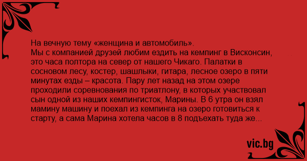 Мы с компанией друзей любим ездить на кемпинг в Висконсин, это часа полтора на север от нашего Чикаго. Палатки в сосновом лесу, костер, шашлыки, гитара, лесное озеро в пяти минутах езды – красота. Пару лет назад на этом озере проходили соревнования по триатлону, в которых участвовал сын одной из наших кемпингисток, Марины. В 6 утра он взял мамину машину и поехал из кемпинга на озеро готовиться к старту, а сама Марина хотела часов в 8 подъехать туда же за него поболеть и попросила для этого мой «Аккорд». Мне не жалко, все равно сплю в такую рань. С вечера отдал ключи, а когда проснулся, выслушал от Марины историю, прибавившую ей несколько седых волос.