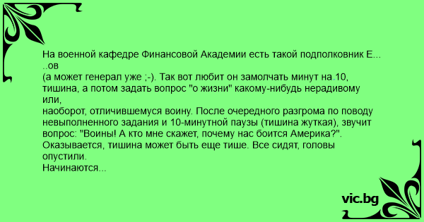 На военной кафедре Финансовой Академии есть такой подполковник Е... ..ов (а может генерал уже ;-). Так вот любит он замолчать минут на 10, тишина, а потом задать вопрос "о жизни" какому-нибудь нерадивому или, наоборот, отличившемуся воину. После очередного разгрома по поводу невыполненного задания и 10-минутной паузы (тишина жуткая), звучит вопрос: "Воины! А кто мне скажет, почему нас боится Америка?". Оказывается, тишина может быть еще тише. Все сидят, головы опустили. Начинаются робко мысли выплескиваться. Все не то. В общем, надоело ему с нами возиться. Произнесенный ответ заставил всех вжаться в плечи и замереть навсегда. "Потому что у нас есть такие ракеты, что даже если бабахнуть их тут, на нашей территории, то мы загнемся сразу, Европа через день, а сама Америка через 5 дней". Пауза. Все пытаются найти скрытый смысл сказанного. Через 10 секунд молчания поднимает руку "отважный" студент Ш...нов, просит разрешения задать вопрос. И так это с обидой в голосе: "А если бабахнуть ТАМ, то мы тоже, получается, загнемся через 5 дней???" Вот когда начинаешь думать о секундах. Слышно, как бьется сердце соседа. Е....ов понимает, что нужно что-то делать. Подумав, взвесив, выдает фразу, после которой занятия были сорваны. "НУ ВОТ ПОТОМУ И БОЯТЬСЯ!". Занавес.