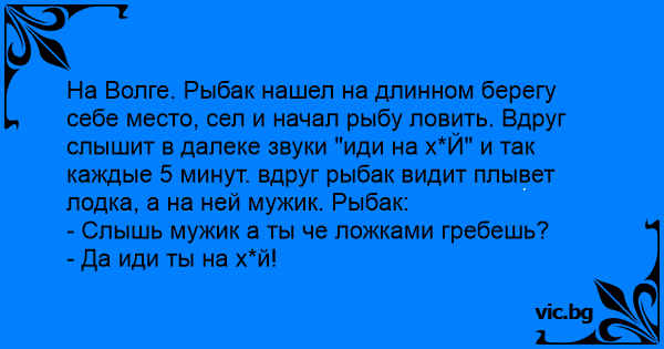 На Волге. Рыбак нашел на длинном берегу себе место, сел и начал рыбу ловить. Вдруг слышит в далеке звуки "иди на хуй" и так каждые 5 минут. вдруг рыбак видит плывет лодка, а на ней мужик. Рыбак: