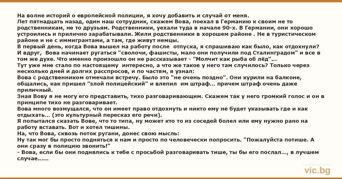 На волне историй о европейской полиции, я хочу добавить и случай от меня. Лет пятнадцать назад, один наш сотрудник, скажем Вова, поехал в Германию к своим не то родственникам, не то друзьям. Родственники, уехали туда в начале 90-х. В Германии, они хорошо устроились и прилично зарабатывали. Жили родственники в хорошем районе . Не в туристическом районе и не с иммигрантами, а там, где живут немцы. В первый день, когда Вова вышел на работу после отпуска, я спрашиваю как было, как отдохнули? И вдруг, Вова начинает ругаться "сволочи, фашисты, мало они получили под Сталинградом" и все в том же духе. Что именно произошло он не рассказывает - "Молчит как рыба об лёд"... Тут уже мне стало по настоящему интересно, а что же такое у него там случилось? Только через несколько дней и долгих расспросов, и по частям, я узнал: Вова с родственником отмечали встречу. Было это "не очень поздно". Они курили на балконе, общались, как пришел "злой полицейский" и влепил им штраф… причем штраф очень даже приличный. Зная Вову я не могу его представить, тихо разговаривающим. Скажем так у него громкий голос и он в принципе тихо не разговаривает. Вова много возмущался, что он имеет право отдохнуть и никто ему не будет указывать где и как отдыхать… (это культурный пересказ его речи). Я попытался сказать Вове, что то типа, ну может кто то из соседей болел или ему нужно рано на работу вставать. Вот и хотел тишины. На, что Вова, сквозь поток ругани, донес свою мысль: Ну так мог бы просто подняться к нам и просто по человечески попросить. "Пожалуйста потише. А они сразу в полицию звонить!" - Вова, если бы они поднялись к тебе с просьбой разговаривать тише, ты бы его послал…, в лучшем случае... *** Время от времени я вспоминаю, как штраф уплаченный Вовой, быстро навел тишину. Вспоминаю когда мой сосед в 12 часов ночи вытаскивают колонки на балкон и начинает петь караоке в компании еще человек десяти. Или когда другой мой сосед в 2 часа ночи решает срочно, что то просверлить перфоратором. Вспоминаю, также, когда лихие джигиты на железном коне, ночью у меня под окном включают музыку на полную громкость, и открыв двери и окна машины общаются с друзьями. Неужели они не понимают, что это мешает соседям? Да они все прекрасно понимают! Только вот соседи им глубоко по… безразличны! А полиции, которая объяснит, что если хочешь веселиться ночью, езжай в паб, рядом нет...