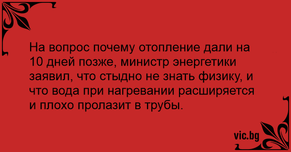 На вопрос почему отопление дали на 10 дней позже, министр энергетики заявил, что стыдно не знать физику, и что вода при нагревании расширяется и плохо пролазит в трубы.