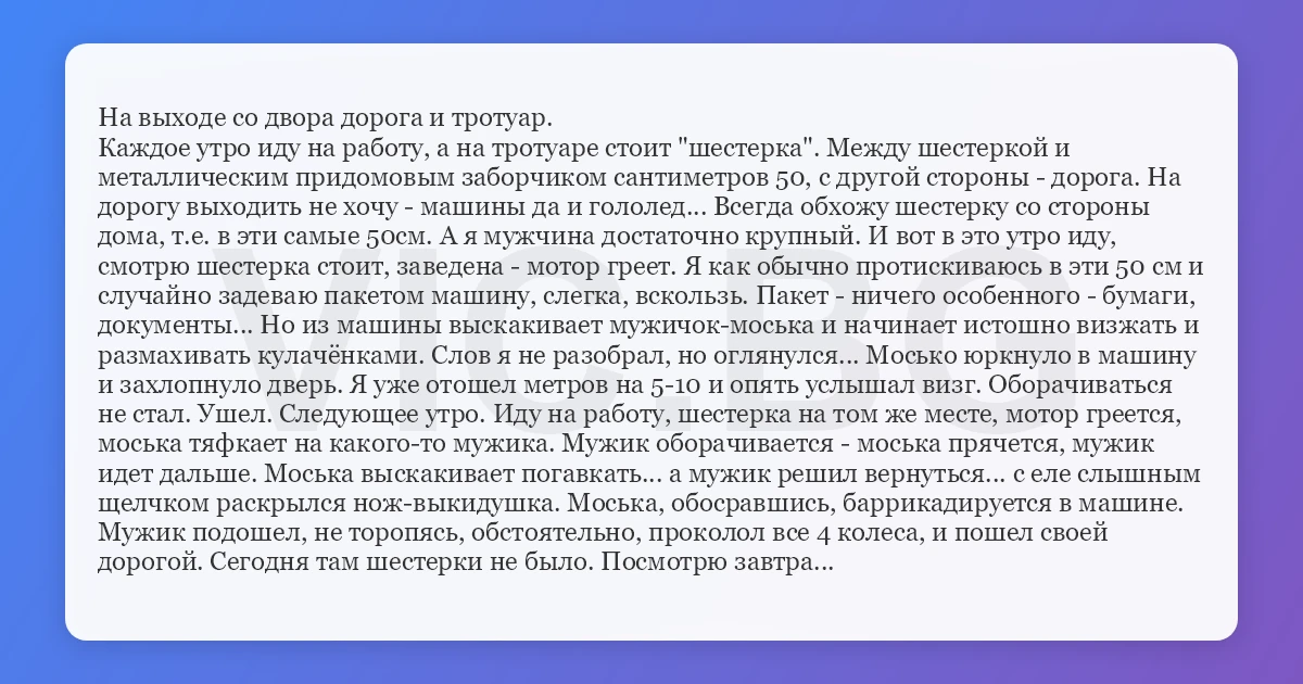 На выходе со двора дорога и тротуар. Каждое утро иду на работу, а на тротуаре стоит "шестерка". Между шестеркой и металлическим придомовым заборчиком сантиметров 50, с другой стороны - дорога. На дорогу выходить не хочу - машины да и гололед... Всегда обхожу шестерку со стороны дома, т.е. в эти самые 50см. А я мужчина достаточно крупный. И вот в это утро иду, смотрю шестерка стоит, заведена - мотор греет. Я как обычно протискиваюсь в эти 50 см и случайно задеваю пакетом машину, слегка, вскользь. Пакет - ничего особенного - бумаги, документы... Но из машины выскакивает мужичок-моська и начинает истошно визжать и размахивать кулачёнками. Слов я не разобрал, но оглянулся... Мосько юркнуло в машину и захлопнуло дверь. Я уже отошел метров на 5-10 и опять услышал визг. Оборачиваться не стал. Ушел. Следующее утро. Иду на работу, шестерка на том же месте, мотор греется, моська тяфкает на какого-то мужика. Мужик оборачивается - моська прячется, мужик идет дальше. Моська выскакивает погавкать... а мужик решил вернуться... с еле слышным щелчком раскрылся нож-выкидушка. Моська, обосравшись, баррикадируется в машине. Мужик подошел, не торопясь, обстоятельно, проколол все 4 колеса, и пошел своей дорогой. Сегодня там шестерки не было. Посмотрю завтра...