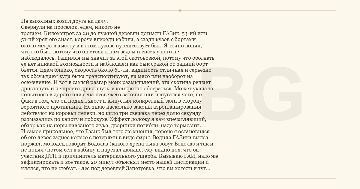 На выходных возил друга на дачу. Свернули на проселок, едем, никого не трогаем. Километров за 20 до нужной деревни догнали ГАЗик, 53-ий или 51-ий хpeн его знает, короче впереди кабина, а сзади кузов с бортами около метра в высоту и в этом кузове путешествует бык. Я точно понял, что это бык, потому что он стоял к нам задом и сисек у него не наблюдалось. Тащимся мы значит за этой скотовозкой, потому что обогнать ее нет никакой возможности и наблюдаем как бык сракой об задний борт бьется. Едем близко, скорость около 60-ти, видимость отличная и серьезно так обсуждаем куда быка транспортируют, на мясо или наоборот на осеменение. И вот в самый разгар моих размышлений, эта скотина решает дристануть и не просто дристануть, а конкретно обосраться. Может укачало копытного в дороге или сена несвежего заточил или испугался чего, но факт в том, что он поднял хвост и выпустил конкретный залп в сторону вероятного противника. Не знаю насколько законы аэропланирования действуют на коровьи лепехи, но кило три свежака через долю секунду размазались по капоту и лобовухе. Эффект доложу я вам впечатляющий, обзор как из норы навозного жука, дворники погибли, надо тормозить ... И самое прикольное, что Газик был того же мнения, короче я остановился об его левое заднее колесо с потерями в виде фары. Водила ГАЗика вылез поржал, молодец говорит Водолаз (какого хpeнa быка зовут Водолаз я так и не понял) потом сел в кабину и нарезал дальше, ему видно пох, что он участник ДТП и причинитель материального ущерба. Вызываю ГАИ, надо же зафиксировать и все такое. 20 минут объяснял место нашей дислокации и клялся, что не стебусь - лес под деревней Запетуевка, что вы хотели и тут ДТП случаются раз в сто лет. Обещали приехать, сидим ждем. Час ждем, два ждем, дождик пошел, на улице холодно, сыро, а мы в машине, красота, капельки по крыше барабанят так мелодично, говно по стеклу стекает, бля, и тут я понял, что если дождем смоет все вещественные доказательства, я буду по любому не прав. Хватаю зонтик, выскакиваю на улицу спасать дерьмо. Закрывать от дождя и себя и бычьи экскременты одновременно не получается, жертвую собой. Стою, мокну, но процесс утечки дерьма временно приостановлен. Редкие пешеходы подозрительно косятся и обходят стороной, еще бы, стоит мужик и зонтом закрывает кучу навоза на капоте, идиот, однозначно, я бы к такому близко не подошел. Прошел еще час, дождик кончился. Критический осмотр машины показал существенные потери в объеме и толщине навозного слоя, кажется через него уже можно смотреть, нее, так не пойдет. Друг предлагает исправить ситуацию до приезда ГАИ, путем переноса части дерьма с капота на стекло и сам принимается за дело под моим чутким руководством, когда оставались уже последние штрихи подъехали ДПСы. Мы были так увлечены творчеством, что заметили их далеко не сразу. Ты слева подкинь, сказал кто-то сзади, да-да, Вась, слева говнеца подбавь, поддержал я... поворачиваться уже не хотелось. Дальше было много-много мата и отбирание прав, завтра я пойду разбираться, говорят, ГАЗик написал, что я ему борт пробил. Н. Питерский