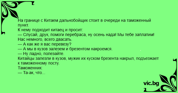 Китайцы залезли в кузов, мужик их куском брезента накрыл, подъезжает к таможенному посту.