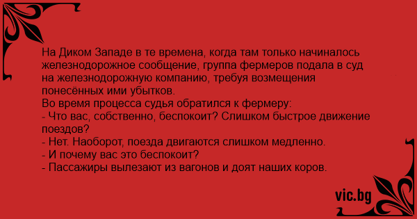 На Диком Западе в те времена, когда там только начиналось железнодорожное сообщение, группа фермеров подала в суд на железнодорожную компанию, требуя возмещения понесённых ими убытков.