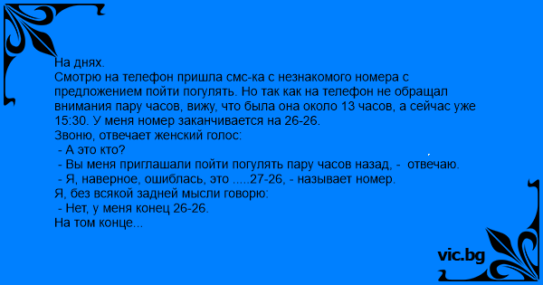 Смотрю на телефон пришла смс-ка с незнакомого номера с предложением пойти погулять. Но так как на телефон не обращал внимания пару часов, вижу, что была она около 13 часов, а сейчас уже 15:30. У меня номер заканчивается на 26-26.