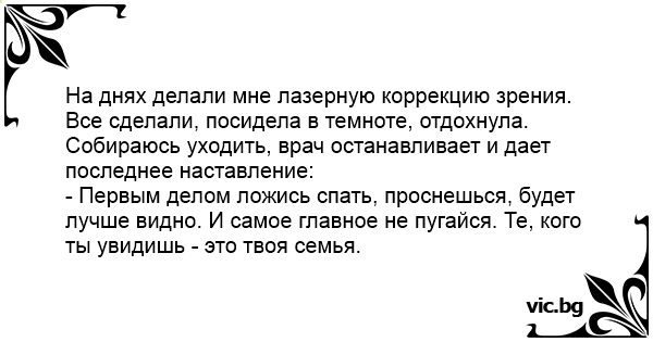 На днях делали мне лазерную коррекцию зрения. Все сделали, посидела в темноте, отдохнула. Собираюсь уходить, врач останавливает и дает последнее наставление:
