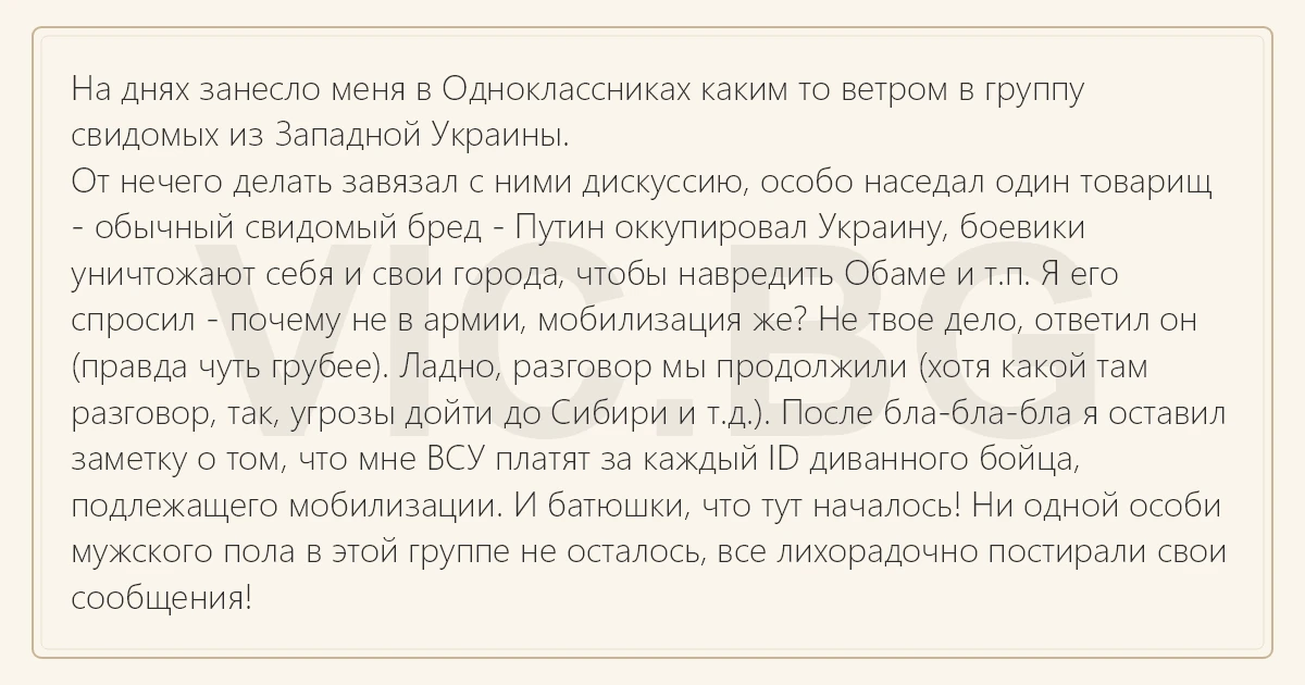 На днях занесло меня в Одноклассниках каким то ветром в группу свидомых из Западной Украины. От нечего делать завязал с ними дискуссию, особо наседал один товарищ - обычный свидомый бред - Путин оккупировал Украину, боевики уничтожают себя и свои города, чтобы навредить Обаме и т.п. Я его спросил - почему не в армии, мобилизация же? Не твое дело, ответил он (правда чуть грубее). Ладно, разговор мы продолжили (хотя какой там разговор, так, угрозы дойти до Сибири и т.д.). После бла-бла-бла я оставил заметку о том, что мне ВСУ платят за каждый ID диванного бойца, подлежащего мобилизации. И батюшки, что тут началось! Ни одной особи мужского пола в этой группе не осталось, все лихорадочно постирали свои сообщения!