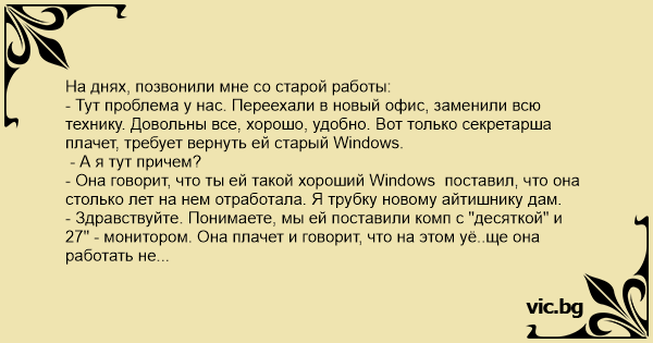 - Она говорит, что ты ей такой хороший Windows поставил, что она столько лет на нем отработала. Я трубку новому айтишнику дам.