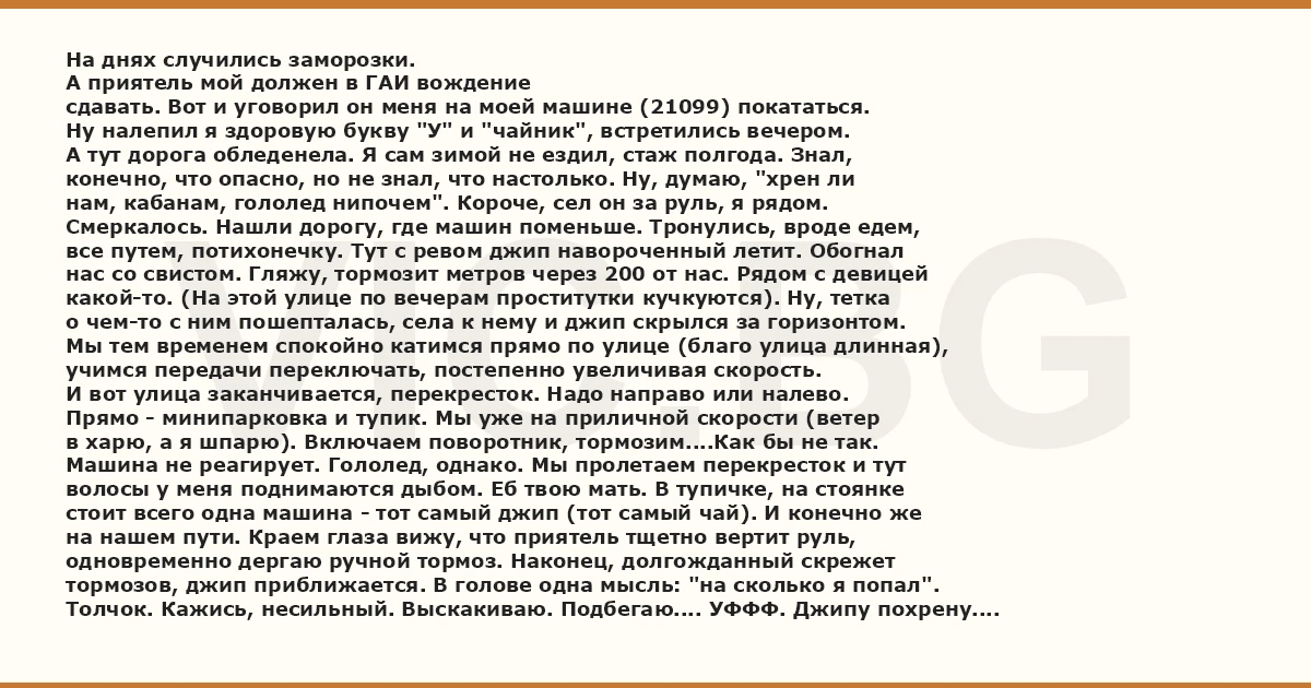 нам, кабанам, гололед нипочем". Короче, сел он за руль, я рядом.