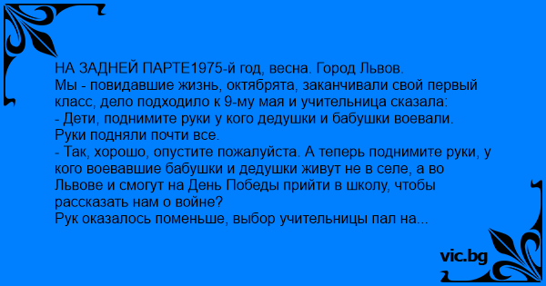 - Так, хорошо, опустите пожалуйста. А теперь поднимите руки, у кого воевавшие бабушки и дедушки живут не в селе, а во Львове и смогут на День Победы прийти в школу, чтобы рассказать нам о войне?