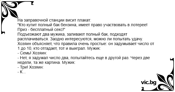 Подъезжают два мужика, заливают полный бак, подходят расплачиваться. Заодно интересуются, можно ли попытать удачу. Хозяин объясняет, что правила очень простые: он задумывает число от 1 до 10, кто отгадает, тот и выиграл. Мужик: