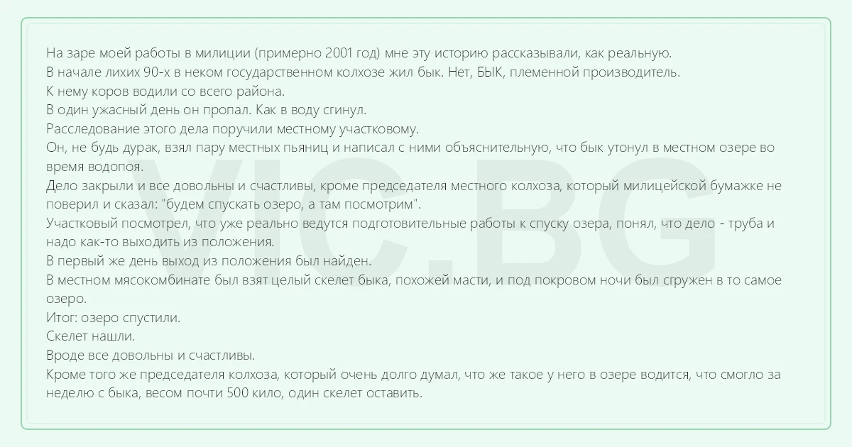 На заре моей работы в милиции (примерно 2001 год) мне эту историю рассказывали, как реальную. В начале лихих 90-х в неком государственном колхозе жил бык. Нет, БЫК, племенной производитель. К нему коров водили со всего района. В один ужасный день он пропал. Как в воду сгинул. Расследование этого дела поручили местному участковому. Он, не будь дуpak, взял пару местных пьяниц и написал с ними объяснительную, что бык утонул в местном озере во время водопоя. Дело закрыли и все довольны и счастливы, кроме председателя местного колхоза, который милицейской бумажке не поверил и сказал: "будем спускать озеро, а там посмотрим". Участковый посмотрел, что уже реально ведутся подготовительные работы к спуску озера, понял, что дело - труба и надо как-то выходить из положения. В первый же день выход из положения был найден. В местном мясокомбинате был взят целый скелет быка, похожей масти, и под покровом ночи был сгружен в то самое озеро. Итог: озеро спустили. Скелет нашли. Вроде все довольны и счастливы. Кроме того же председателя колхоза, который очень долго думал, что же такое у него в озере водится, что смогло за неделю с быка, весом почти 500 кило, один скелет оставить.