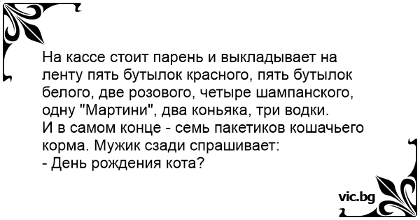 На кассе стоит парень и выкладывает на ленту пять бутылок красного, пять бутылок белого, две розового, четыре шампанского, одну "Мартини", два коньяка, три водки.
