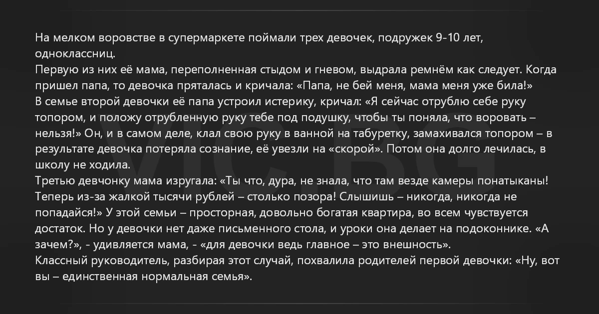 На мелком воровстве в супермаркете поймали трех девочек, подружек 9-10 лет, одноклассниц. Первую из них её мама, переполненная стыдом и гневом, выдрала ремнём как следует. Когда пришел папа, то девочка пряталась и кричала: «Папа, не бей меня, мама меня уже била!» В семье второй девочки её папа устроил истерику, кричал: «Я сейчас отрублю себе руку топором, и положу отрубленную руку тебе под подушку, чтобы ты поняла, что воровать – нельзя!» Он, и в самом деле, клал свою руку в ванной на табуретку, замахивался топором – в результате девочка потеряла сознание, её увезли на «скорой». Потом она долго лечилась, в школу не ходила. Третью девчонку мама изругала: «Ты что, дура, не знала, что там везде камеры понатыканы! Теперь из-за жалкой тысячи рублей – столько позора! Слышишь – никогда, никогда не попадайся!» У этой семьи – просторная, довольно богатая квартира, во всем чувствуется достаток. Но у девочки нет даже письменного стола, и уроки она делает на подоконнике. «А зачем?», - удивляется мама, - «для девочки ведь главное – это внешность». Классный руководитель, разбирая этот случай, похвалила родителей первой девочки: «Ну, вот вы – единственная нормальная семья».