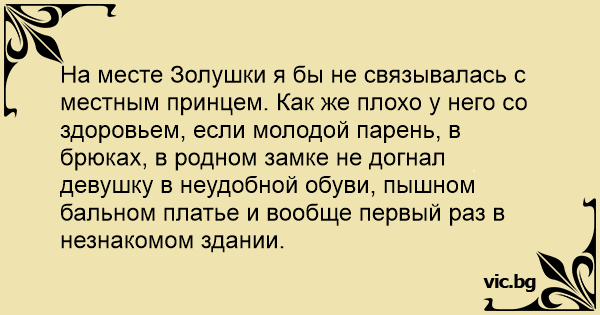 На месте Золушки я бы не связывалась с местным принцем. Как же плохо у него со здоровьем, если молодой парень, в брюках, в родном замке не догнал девушку в неудобной обуви, пышном бальном платье и вообще первый раз в незнакомом здании.