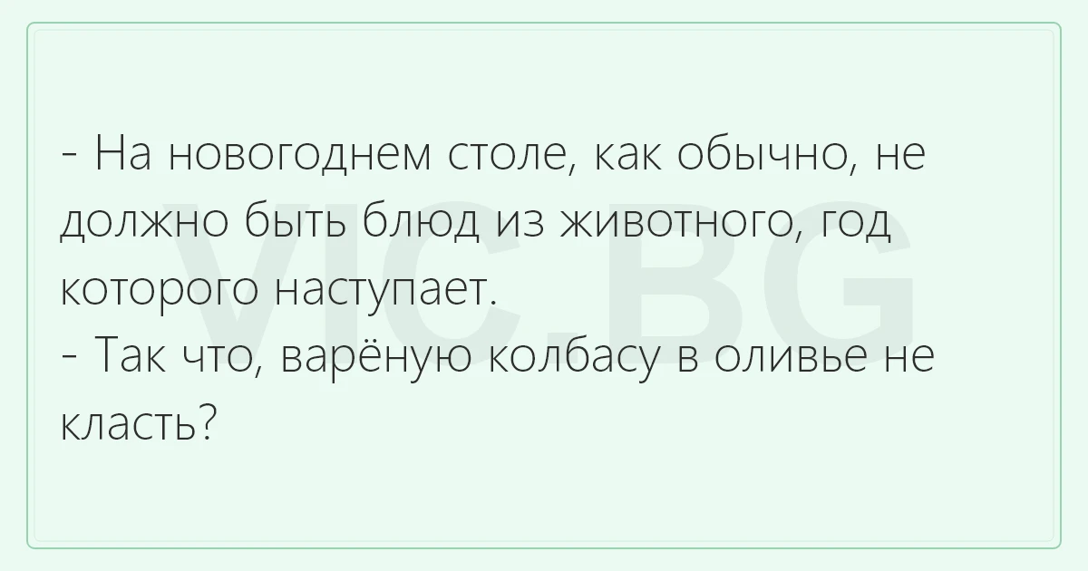 - На новогоднем столе, как обычно, не должно быть блюд из животного, год которого наступает. - Так что, варёную колбасу в оливье не класть?