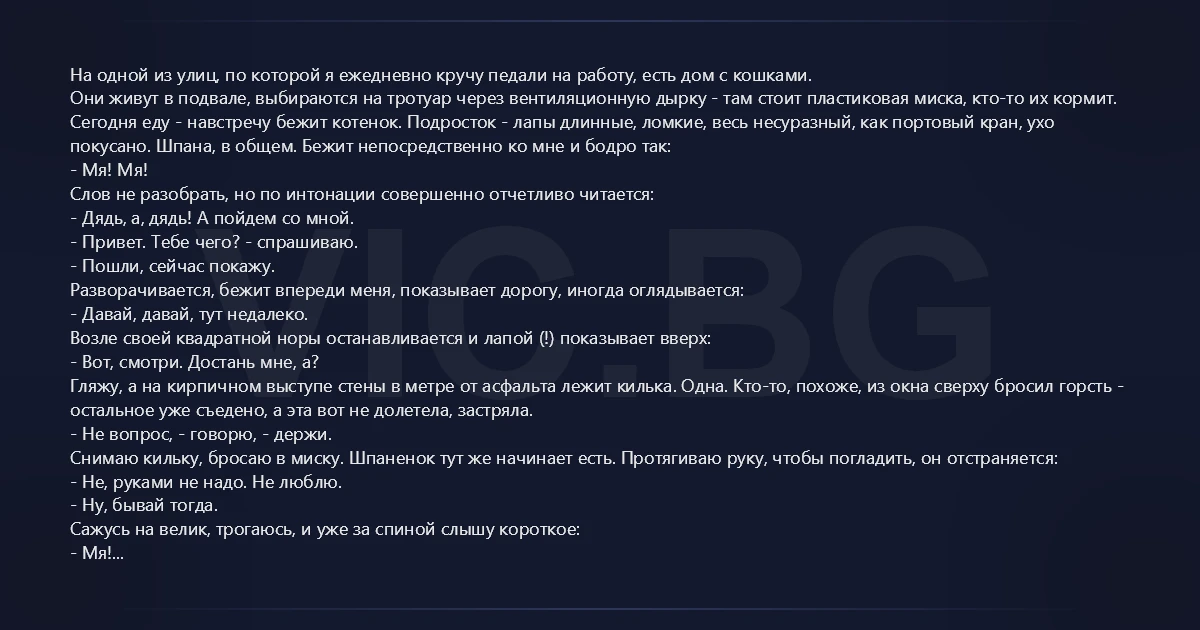 На одной из улиц, по которой я ежедневно кручу педали на работу, есть дом с кошками. Они живут в подвале, выбираются на тротуар через вентиляционную дырку - там стоит пластиковая миска, кто-то их кормит. Сегодня еду - навстречу бежит котенок. Подросток - лапы длинные, ломкие, весь несуразный, как портовый кран, ухо покусано. Шпана, в общем. Бежит непосредственно ко мне и бодро так: - Мя! Мя! Слов не разобрать, но по интонации совершенно отчетливо читается: - Дядь, а, дядь! А пойдем со мной. - Привет. Тебе чего? - спрашиваю. - Пошли, сейчас покажу. Разворачивается, бежит впереди меня, показывает дорогу, иногда оглядывается: - Давай, давай, тут недалеко. Возле своей квадратной норы останавливается и лапой (!) показывает вверх: - Вот, смотри. Достань мне, а? Гляжу, а на кирпичном выступе стены в метре от асфальта лежит килька. Одна. Кто-то, похоже, из окна сверху бросил горсть - остальное уже съедено, а эта вот не долетела, застряла. - Не вопрос, - говорю, - держи. Снимаю кильку, бросаю в миску. Шпаненок тут же начинает есть. Протягиваю руку, чтобы погладить, он отстраняется: - Не, руками не надо. Не люблю. - Ну, бывай тогда. Сажусь на велик, трогаюсь, и уже за спиной слышу короткое: - Мя! - Не за что.