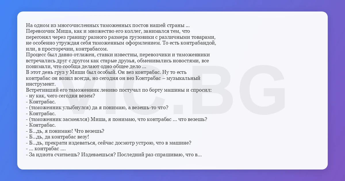 - (таможенник засмеялся) Миша, я понимаю, что контрабас ... что везешь?