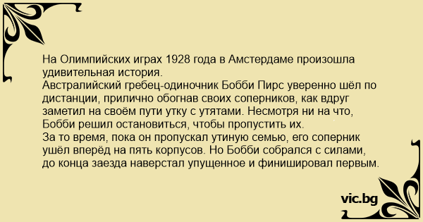 Австралийский гребец-одиночник Бобби Пирс уверенно шёл по дистанции, прилично обогнав своих соперников, как вдруг заметил на своём пути утку с утятами. Несмотря ни на что, Бобби решил остановиться, чтобы пропустить их.