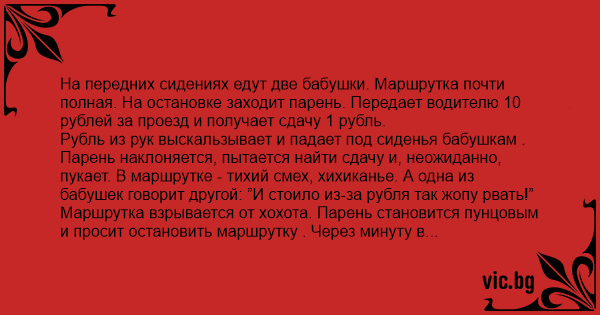 Рубль из рук выскальзывает и падает под сиденья бабушкам . Парень наклоняется, пытается найти сдачу и, неожиданно, пукает. В маршрутке - тихий смех, хихиканье. А одна из бабушек говорит другой: ”И стоило из-за рубля так жопу рвать!” Маршрутка взрывается от хохота. Парень становится пунцовым и просит остановить маршрутку . Через минуту в маршрутку заходит солидная дама . Маршрутка продолжает смеяться. Дама начинает себя нервно осматривать. Может, это над ней смеются? Тут бабушки, покатываясь от смеха, начинают рассказывать даме историю с рублем. Дама тоже начинает смеяться и тут у нее из носа вылетает сопля и попадает на бабушек .... Дама просит остановить маршрутку. Едем дальше, покатываясь от смеха. Водитель тоже вместе со всеми хохочет, достает сигареты, закуривает, приоткрывает люк над головой. Выпуская дым в люк, обращается к бабушкам: ”Вам под люком (падлюкам) не дует?” Салон взрывается от нового приступа смеха. Водитель, поняв, что он сказал, вываливается из кабины, пританцовывая и угорает Эта же маршрутка 20 минут спустя. Маршрутка с конечной остановкой ”поселок Сахарный”. Все сели, места заняты... Водила завел машину... Тут дверь открывает бабка... И тут же спрашивает у водилы: ”Милок, у тебя конец Сахарный?”. По маршрутке прошло легкое хихиканье... Водила не долго думая ответил:”Не знаю, не пробовал!”. По маршрутке пошел открытый ржач! Бабка осмотрев ястребиным взглядом салон поняла, что свободных мест нету... И протягивая 10р. водиле сказала: ”Возьми меня стоя!”. Водитель вываливается из кабины в сугроб и трясется в истерическом припадке...