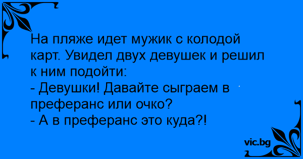 На пляже идет мужик с колодой карт. Увидел двух девушек и решил к ним подойти:
