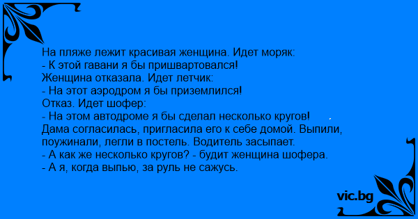 На пляже лежит красивая женщина. Идет моряк: