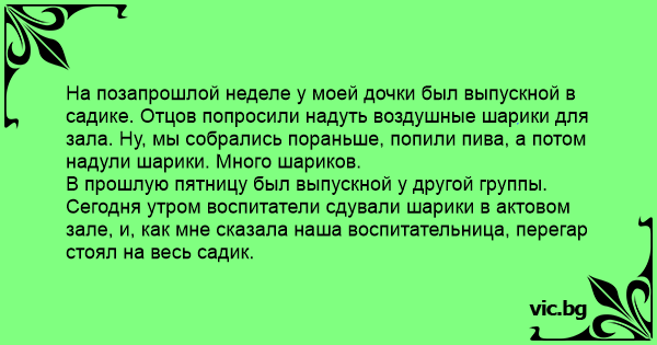 В прошлую пятницу был выпускной у другой группы. Сегодня утром воспитатели сдували шарики в актовом зале, и, как мне сказала наша воспитательница, перегар стоял на весь садик.