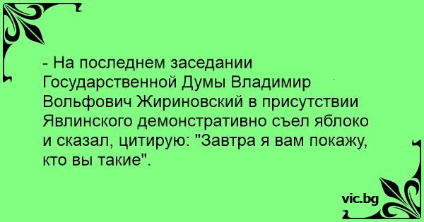 - На последнем заседании Государственной Думы Владимир Вольфович Жириновский в присутствии Явлинского демонстративно съел яблоко и сказал, цитирую: "Завтра я вам покажу, кто вы такие".