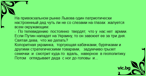 Колоритная украинка, торгующая кабачками, бурячками и другими стратегическими товарами, задумчиво грызет семечки и смотрит куда-то вдаль, наверное в геополитику. Потом оглядывает деда с ног до головы и презрительно замечает: