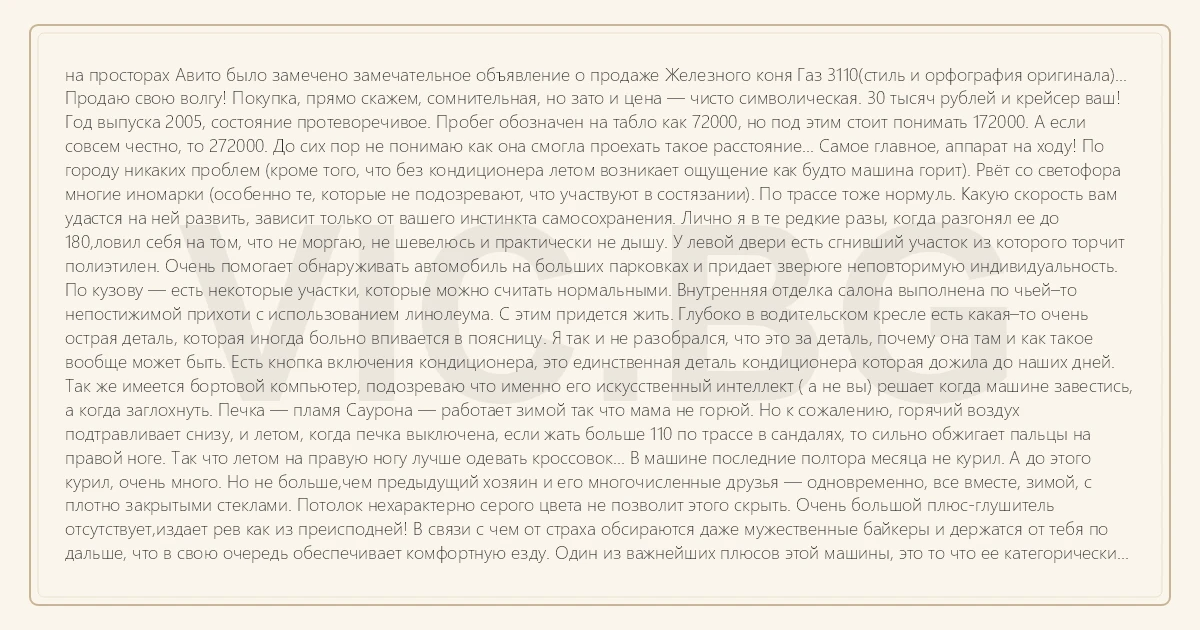 на просторах Авито было замечено замечательное объявление о продаже Железного коня Газ 3110(стиль и орфография оригинала)...