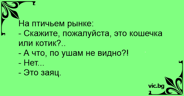 - Vai, ce frumos e! Ce-i ăsta, pisoi ori pisicuţă? - Păi după urechi nu poţi să îţi dai seama? - Nu! - E iepure!
