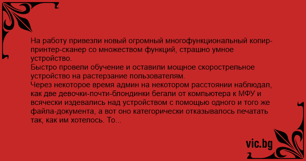 И вот запускают они очередную печать, ждут, а из МФУ вылазит страница А3 с огромным текстом на весь лист - "ХВАТИТ МЕНЯ МУЧАТЬ". Конечно же ее запустил админ со своего рабочего места, отменив при этом их задание печати. Но девочки моментально оставили в покое МФУ и даже обходили немного стороной - вдруг совсем обидится и укусит....
