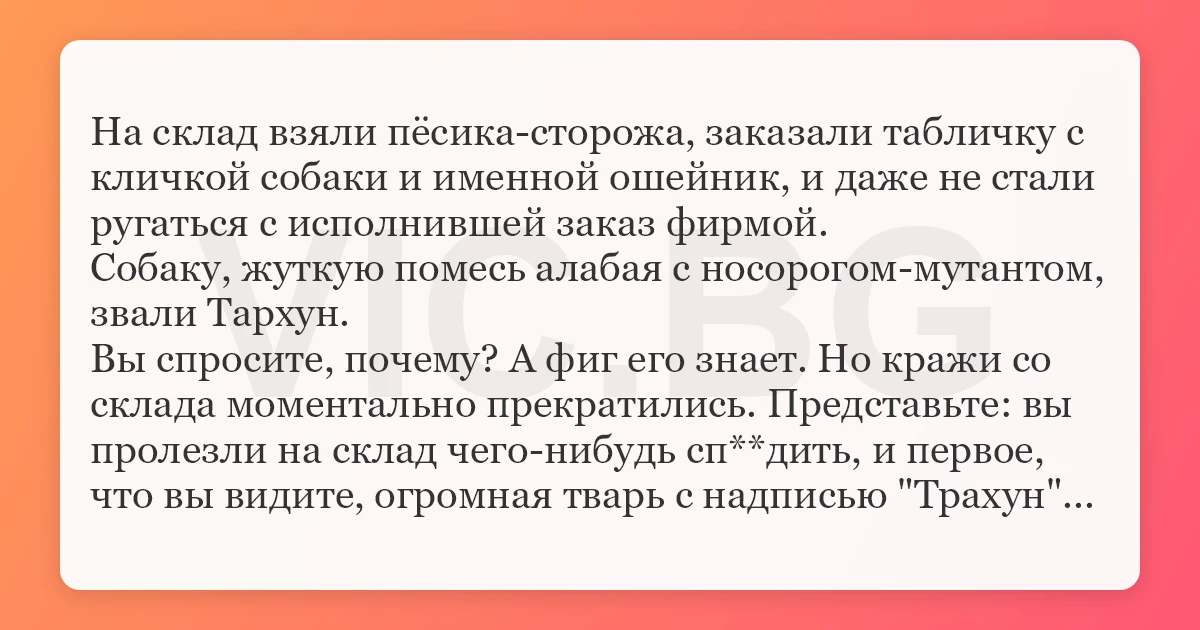 На склад взяли пёсика-сторожа, заказали табличку с кличкой собаки и именной ошейник, и даже не стали ругаться с исполнившей заказ фирмой. Собаку, жуткую помесь алабая с носорогом-мутантом, звали Тархун. Вы спросите, почему? А фиг его знает. Но кражи со склада моментально прекратились. Представьте: вы пролезли на склад чего-нибудь сп**дить, и первое, что вы видите, огромная тварь с надписью "Трахун"...