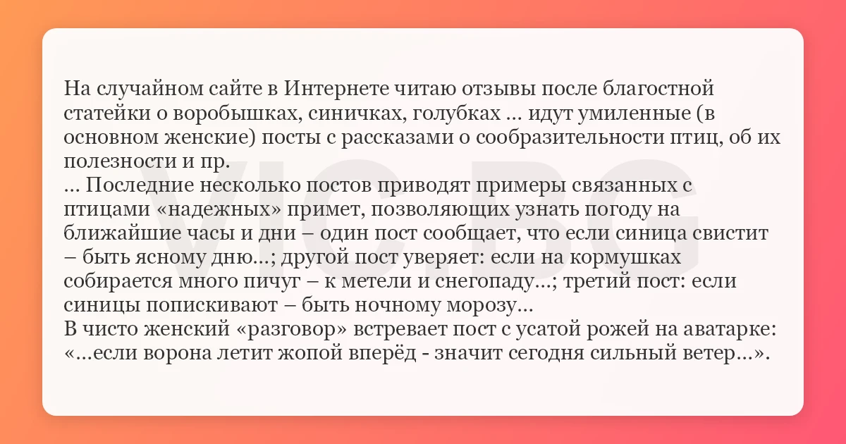 На случайном сайте в Интернете читаю отзывы после благостной статейки о воробышках, синичках, голубках … идут умиленные (в основном женские) посты с рассказами о сообразительности птиц, об их полезности и пр.