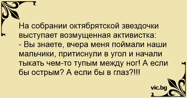 - Вы знаете, вчера меня поймали наши мальчики, притиснули в угол и начали тыкать чем-то тупым между ног! А если бы острым? А если бы в глаз?!!!