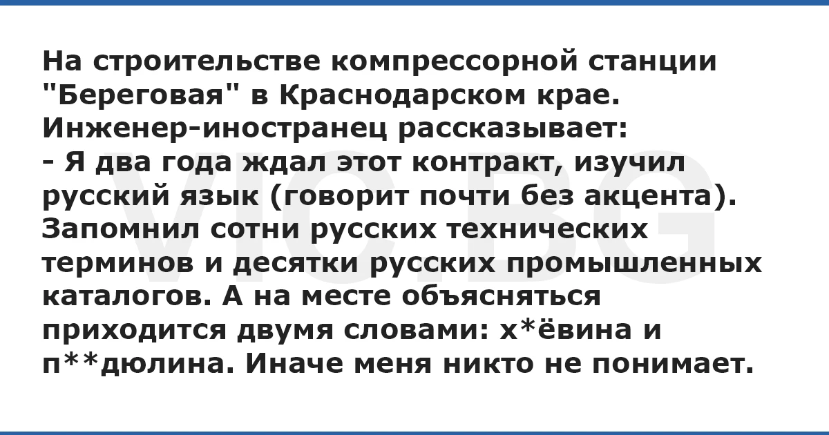 - Я два года ждал этот контракт, изучил русский язык (говорит почти без акцента). Запомнил сотни русских технических терминов и десятки русских промышленных каталогов. А на месте объясняться приходится двумя словами: х*ёвина и п**дюлина. Иначе меня никто не понимает.