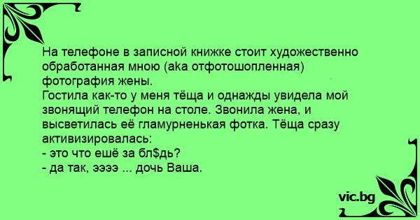 На телефоне в записной книжке стоит художественно обработанная мною (aka отфотошопленная) фотография жены. Гостила как-то у меня тёща и однажды увидела мой звонящий телефон на столе. Звонила жена, и высветилась её гламурненькая фотка. Тёща сразу активизировалась: - это что ешё за бл$дь? - да так, ээээ ... дочь Ваша.