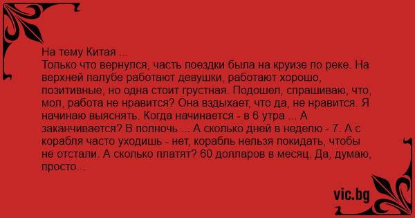 Только что вернулся, часть поездки была на круизе по реке. На верхней палубе работают девушки, работают хорошо, позитивные, но одна стоит грустная. Подошел, спрашиваю, что, мол, работа не нравится? Она вздыхает, что да, не нравится. Я начинаю выяснять. Когда начинается - в 6 утра ... А заканчивается? В полночь ... А сколько дней в неделю - 7. А с корабля часто уходишь - нет, корабль нельзя покидать, чтобы не отстали. А сколько платят? 60 долларов в месяц. Да, думаю, просто кошмар, даже не знаю, что из этого списка тяжелее всего ... Решаю спросить, а что именно ей не нравится? Ответ меня поразил... Проблема в том, что на верхней палубе им не разрешают ходить с зонтиками, а если азиатская девушка загорит и ее кожа потемнеет, то она себя чувствует страшной и непривлекательной, а вот это - кошмар! А 18 часов в день 7 дней в неделю - это ее как раз вполне устраивает, и если бы дали зонтики, то все было бы замечательно, а они не дают :(