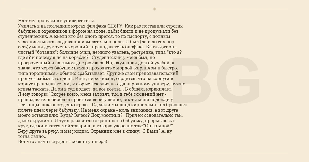На тему пропусков в университеты. Училась я на последних курсах филфака СПбГУ. Как раз поставили строгих бабушек и охранников в форме на входе, дабы бдили и не пропускали без студенческих. А ежели кто без оного прется, то по паспорту, с полным указанием места следования и желательно цели. И был (да и до сих пор есть)у меня друг очень хороший - преподаватель биофака. Выглядит он - чистый "ботаник": большие очки, немного увалень, растрепка, типа "кто я? где я? и почему я не на корабле?" Студенческий у меня был, но просроченный и на самом дне рюкзака. Но, наученная долгой учебой, я знала, что через бабушек нужно проходить с мордой-кирпичом и быстро, типа торопишься,- обычно срабатывает. Друг же свой преподавательский пропуск забыл в тот день. Идет, переживает, сердится, что из корпуса в корпус преподавателям, которые всю жизнь отдали родному универу, нужно ксивы таскать. Да он в суд подаст, да все козлы... В общем, нервничает. Я ему говорю:"Скорее всего, меня заловят, т.к. в тебе сомнений нет - преподавателя биофака просто за версту видно, так ты меня подожди у лестницы, пока я студень отрою". Сделали мы лица кирпичами - на бреющем полете идем через бабульку. На меня охрана - ноль внимания, а вот друга моего остановили:"Куда? Зачем? Документики?" Причем основательно так, даже окружили. И тут я раздвигаю охранника и бабульку, прорываюсь в круг, где кипятится мой товарищ, и говорю уверенно так:"Он со мной!" Беру друга за руку, и мы уходим. Охранник мне в спину:"С Вами? А, ну тогда ладно..." Вот что значит студент - хозяин универа!