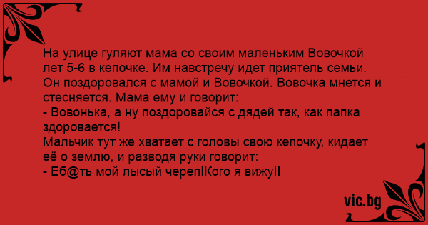 На улице гуляют мама со своим маленьким Вовочкой лет 5-6 в кепочке. Им навстречу идет приятель семьи. Он поздоровался с мамой и Вовочкой. Вовочка мнется и стесняется. Мама ему и говорит: