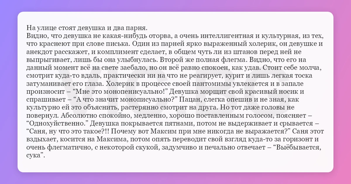 Видно, что девушка не какая-нибудь оторва, а очень интеллигентная и культурная, из тех, что краснеют при слове писька. Один из парней ярко выраженный холерик, он девушке и анекдот расскажет, и комплимент сделает, в общем чуть ли из штанов перед ней не выпрыгивает, лишь бы она улыбнулась. Второй же полная флегма. Видно, что его на данный момент всё на свете заебало, но он всё равно спокоен, как удав. Стоит себе молча, смотрит куда-то вдаль, практически ни на что не реагирует, курит и лишь легкая тоска затуманивает его глаза. Холерик в процессе своей пантомимы увлекается и в запале произносит – “Мне это монопенисуально!” Девушка морщит свой красивый носик и спрашивает – “А что значит монописуально?” Пацан, слегка опешив и не зная, как культурно ей это объяснить, растерянно смотрит на друга. Но тот даже головы не повернул. Абсолютно спокойно, медленно, хорошо поставленным голосом, поясняет – “Однохуйственно.” Девушка покрывается пятнами, потом не выдерживает и срывается – “Саня, ну что это такое?!! Почему вот Максим при мне никогда не выражается?” Саня этот вздыхает, косится на Максима, потом опять переводит свой взгляд куда-то за горизонт и очень флегматично, с некоторой скукой, задумчиво и печально отвечает – “Выёбывается, cуka”.