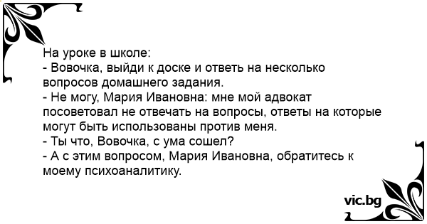 - Не могу, Мария Ивановна: мне мой адвокат посоветовал не отвечать на вопросы, ответы на которые могут быть использованы против меня.