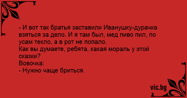 - И вот так братья заставили Иванушку-дурачка взяться за дело. И я там был, мед пиво пил, по усам текло, а в рот не попало.
